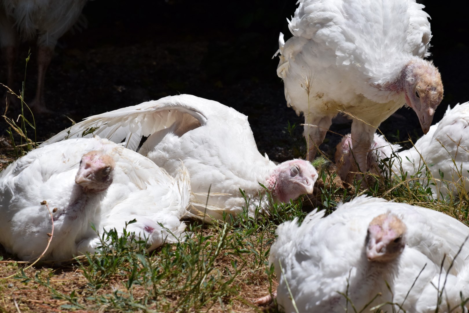 As the activists slid open the heavy shed door, a sea of young turkeys stood before them. The smell was so overpowering that the activists’ hands instinctively went up to cover their mouths and noses. One activist recalled: “It was quiet outside, but when the doors opened I was hit with a loud vibrating noise and an overwhelming smell”. This loud vibrating noise shattered the silence. Squinting in low light, the activists tried to make out where the shed ended. Thousands upon thousands of 4-6 week old turkeys (‘poults’) lay quietly. Corpses in varying states littered the ground.